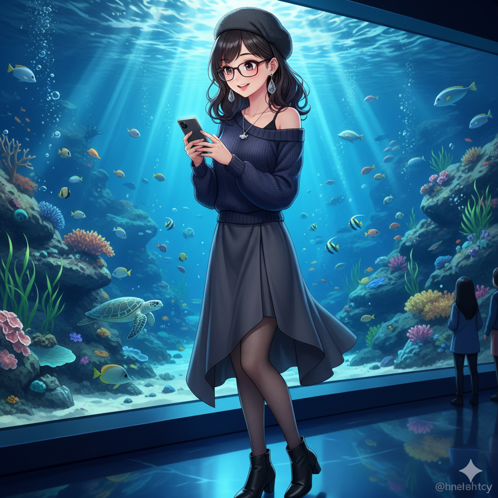 **Light:** (cool, ethereal blue ambient light emanating from the giant tank:1.4), (dramatic shafts of light creating contrast and highlighting the underwater topography), (the character is softly illuminated by the glow of the tank and her phone screen:1.3)