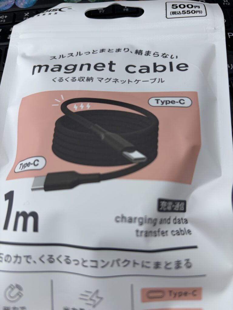 ダイソーで売られていたType-Cのケーブル。流行のマグネットでまとめるタイプです。