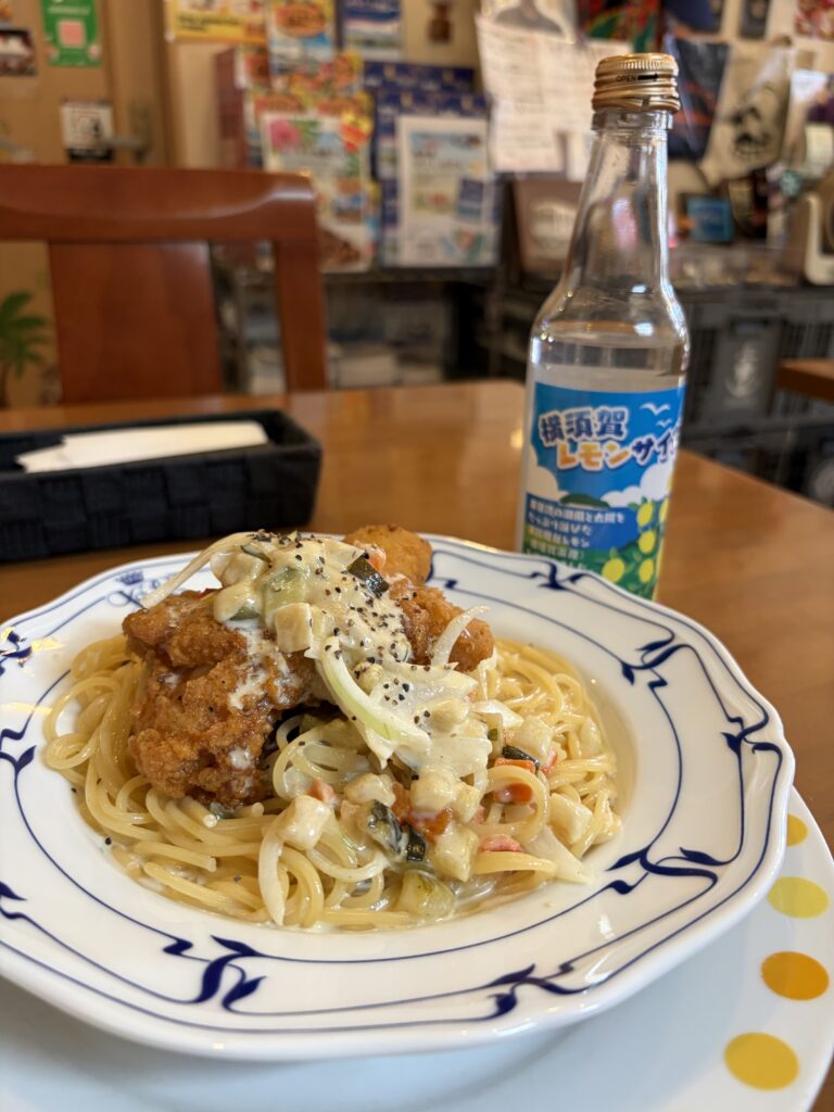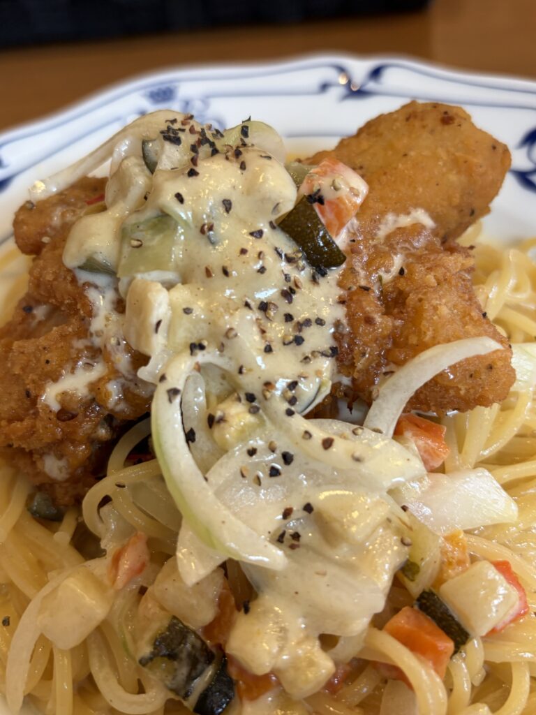 ただの濃厚なクリームパスタにあらず。クラムチャウダーの野菜やピクルスを加えることで、味に刺激感とフライドチキンとの調和を図っています。