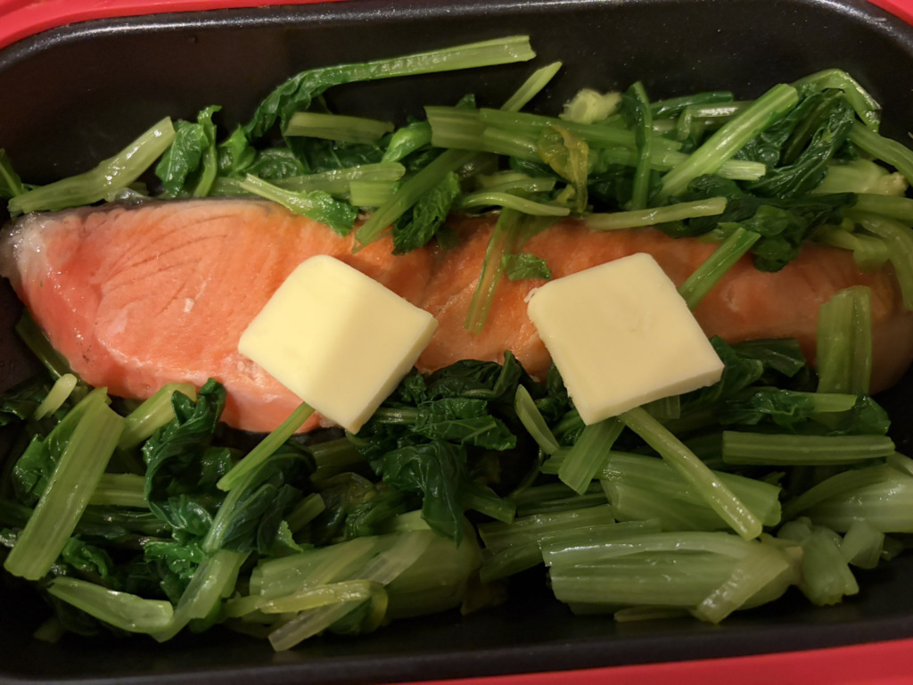 裏返したあとにレンジの魚焼き器の隙間にほうれん草を敷き、バターで味付け。