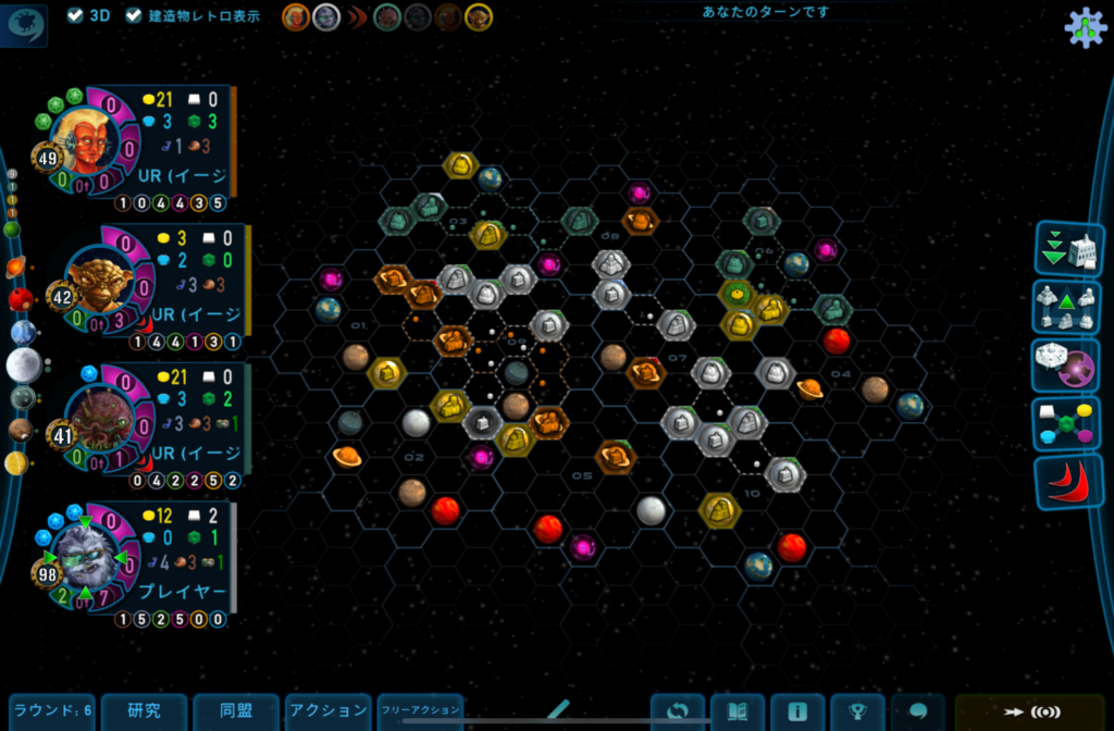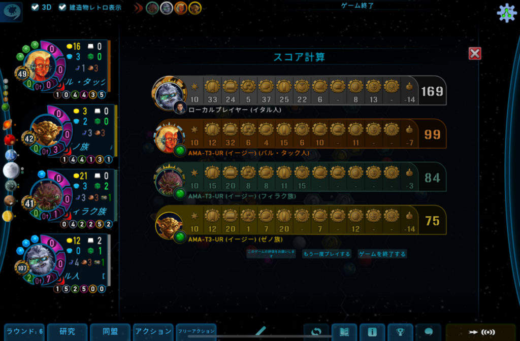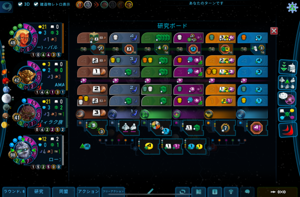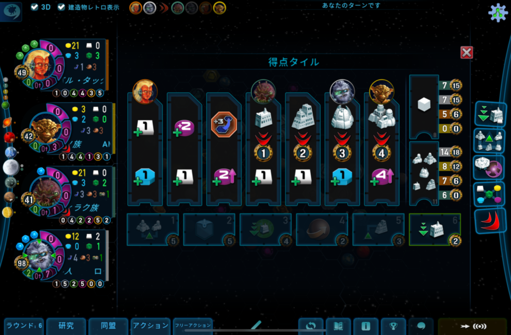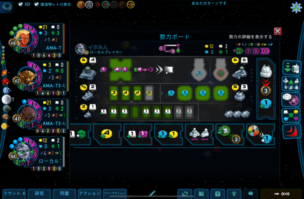 ラウンドブースターも研究所×3をしっかりと建てた上でパスしたため、学院を建てる必要は無く。(そもそも14施設なので、3同盟は保証されています)