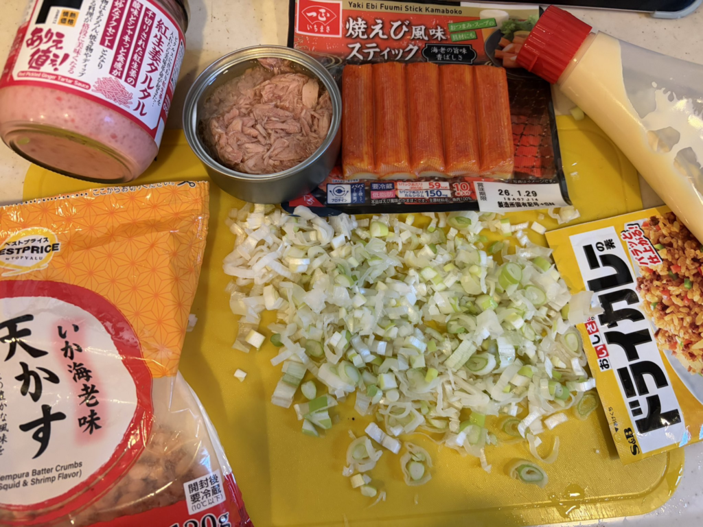 いつもはツナ缶を入れるところを、「ロースハムブロックが余っていた」として、こちらに差し替え。ツナ缶の油はバターで補いました。