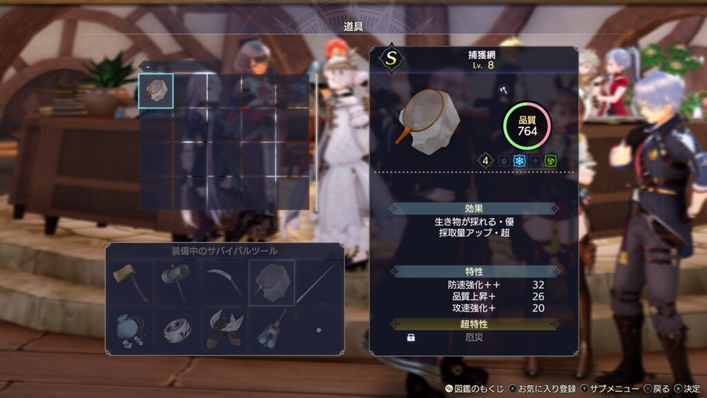 「生き物が採れる・優」で発現を止めた捕獲網。こちらを調合して
