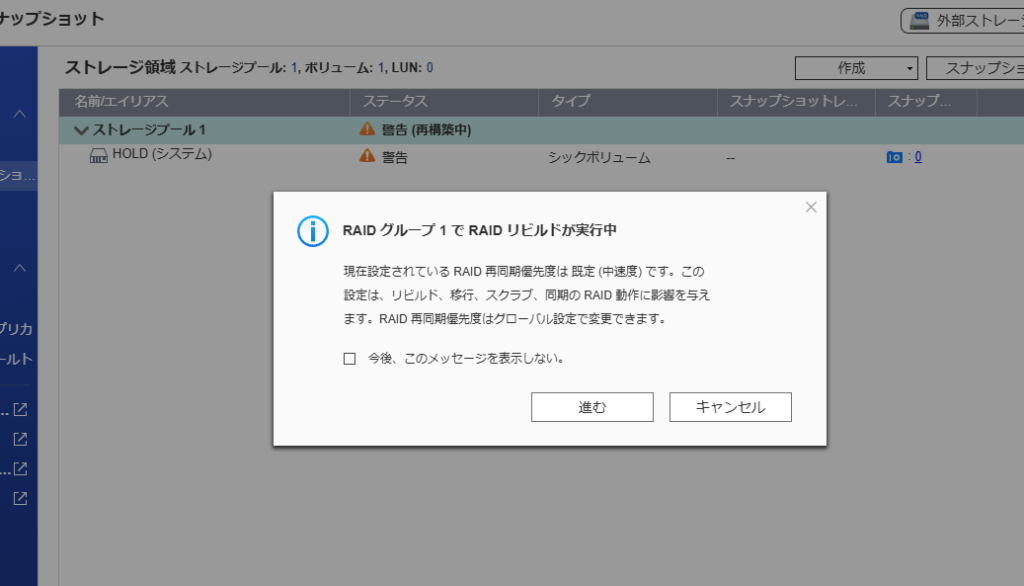エラー 2026-03-27 01:02:40 --- --- localhost --- Storage & Snapshots Disk [Storage & Snapshots] Disk "Host: 3.5" SATA HDD 2" failed. Volume: HOLD, Storage pool: 1.