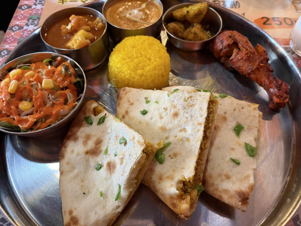 インドカレーセット。おなじみの鉄のプレートにカレーやらサラダやら。