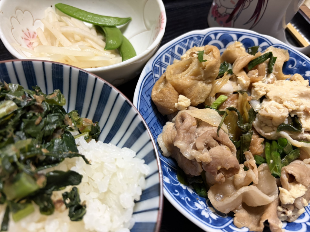 メイン料理は肉豆腐…… に見えて、車麩が入っています。つまり、肉と煮汁の旨味をこちらに吸収させるというやり方。